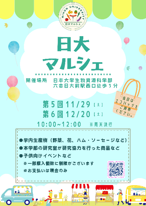 本学における教育・研究を紹介しながら,学内生産物(野菜・肉製品・花)や本学部の教育や研究と関わりのある商品を販売いたします。