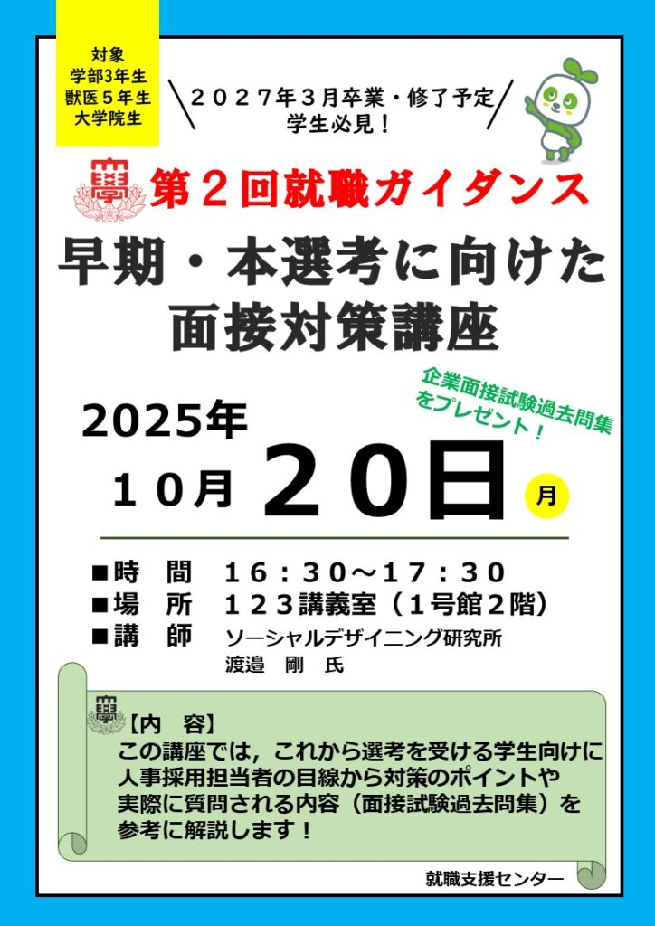 【2027卒年次対象】第2回就職ガイダンス「早期・本選考に向けた面接対策講座(10/20開催)