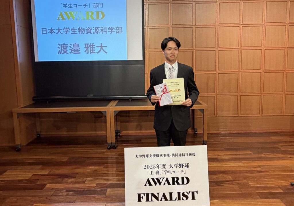 硬式野球部の国際共生学科3年生 渡邉雅大さんが大学野球支援機構主催の「2025年度大学野球学生コーチAWARD」においてAWARDを受賞しました